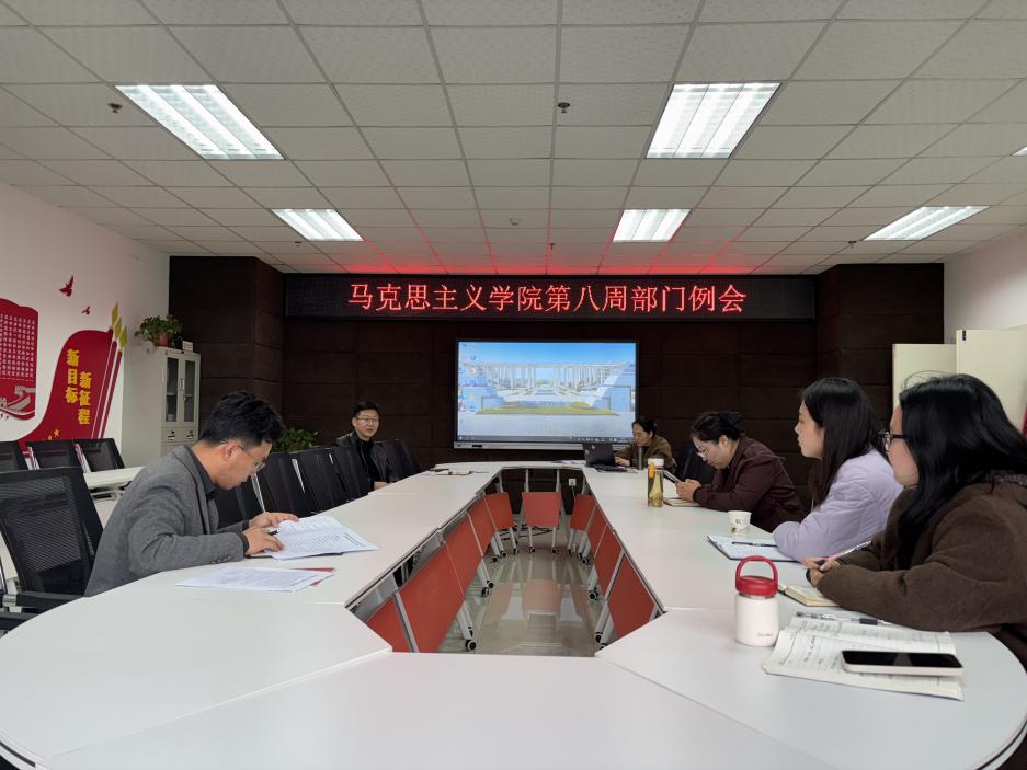 10月27日下午,马克思主义学院在高新校区研习室召开第八周部门例会。会议由副院长孟红松主持,办公室主任翟强强,教研室主任李莉、卢娇娇,工会委员吴婷,教学秘书弥婵、韩佳芮等参加了会议。