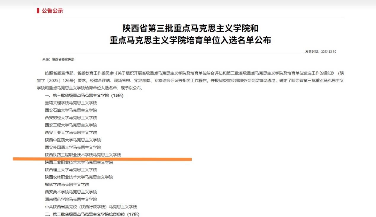 近日,根据《陕西省委宣传部公布陕西省第三批重点马克思主义学院和重点马克思主义学院培育单位入选名单》,我校马克思主义学院成功入选第三批省级重点马克思主义学院。考核成绩位列全省高职第一。