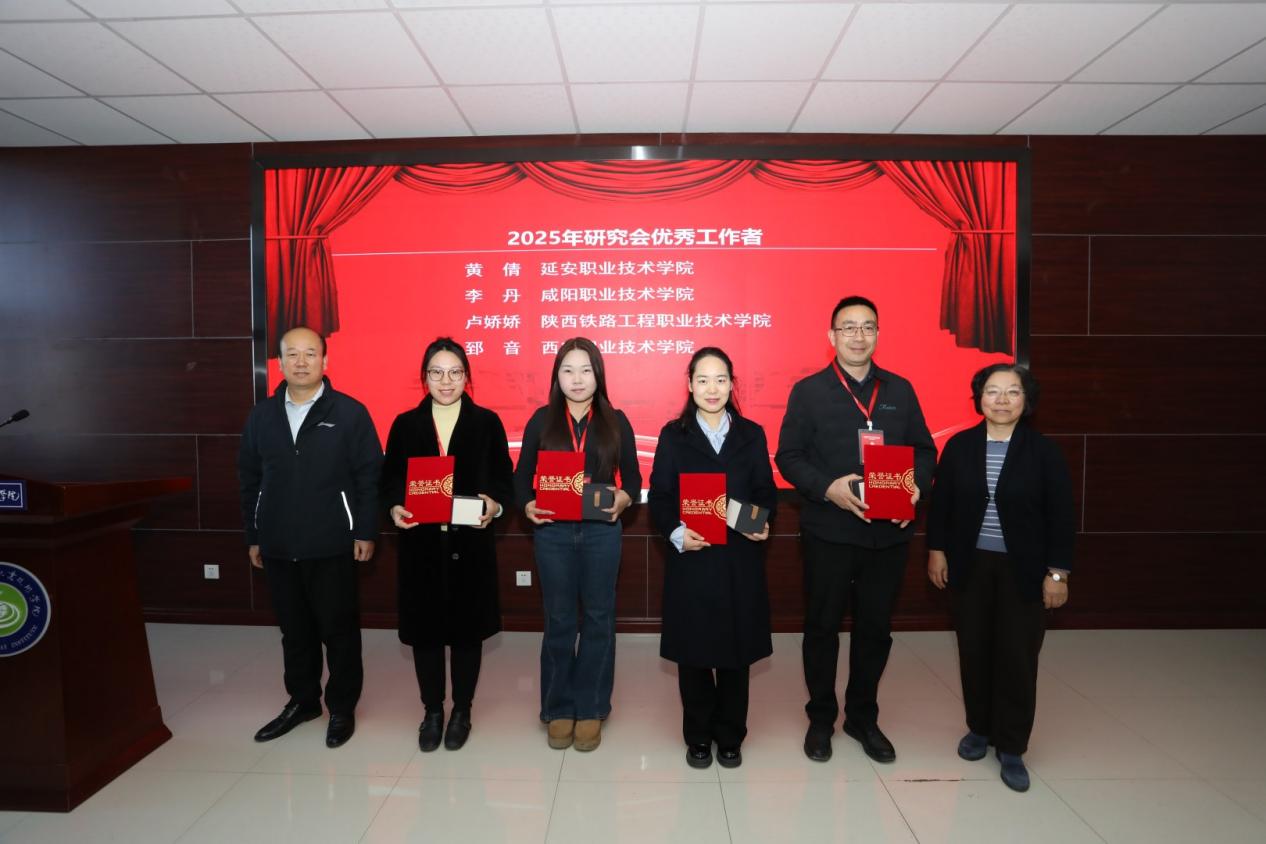 年会颁奖环节中,学校获多项荣誉:2025年“秦马磨课会”优秀组织奖、陕西省第二届职业院校红色全景资源创意展示活动优秀组织奖、2025年“中科杯”知识竞赛活动优秀组织奖三项集体荣誉;学校马克思主义学院教师翟强强、吕瑞琴、卢娇娇获评研究会2025年“优秀工作者”荣誉称号。