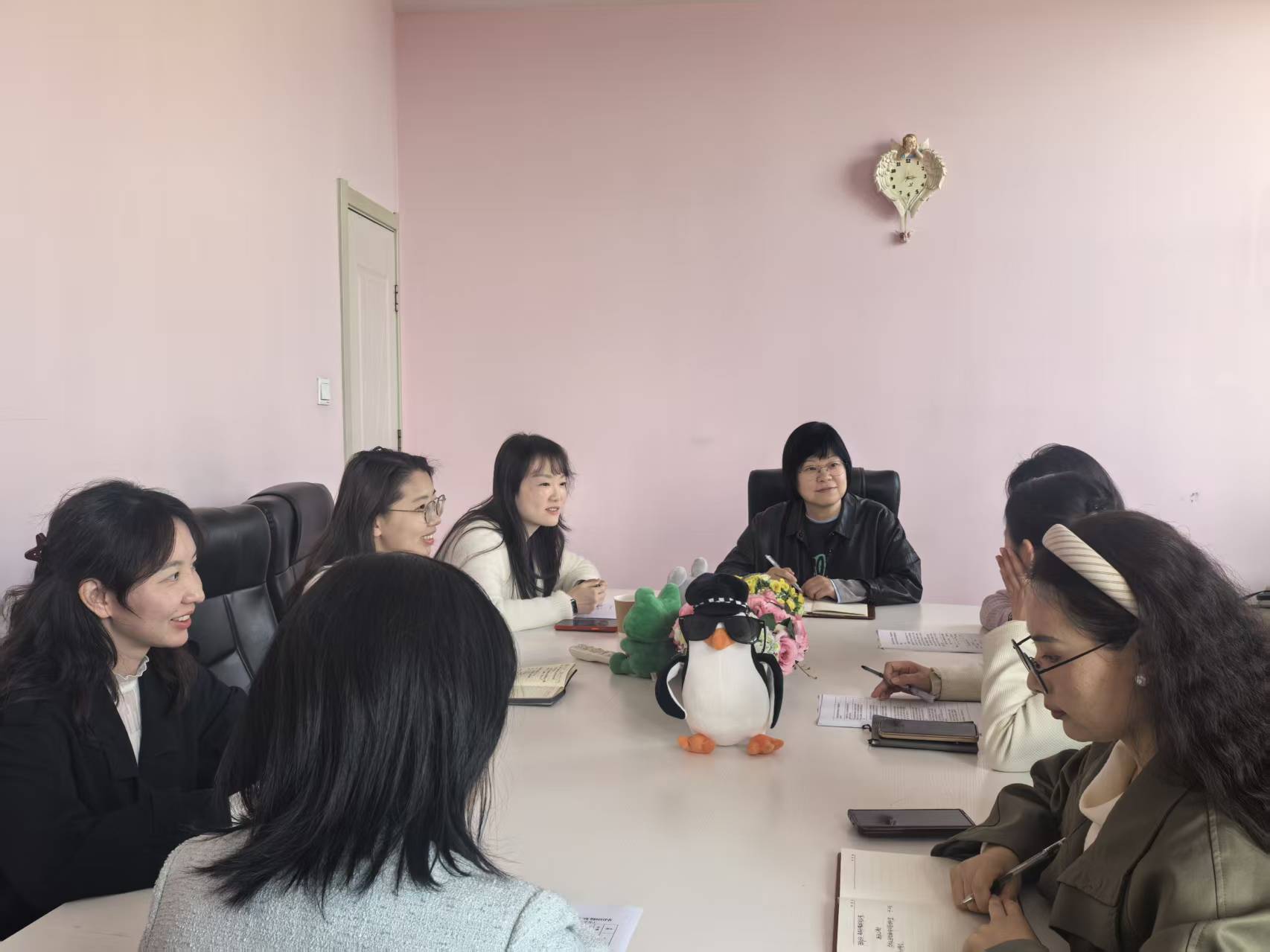 为深化校际思政教育交流合作,共促马克思主义学院内涵建设与高质量发展,2026年4月22日,西安职业技术学院马克思主义学院院长高静娜率德法教研室崔茜、国家安全教育教研室张敏、四史教研室孙海欣一行来陕铁院马克思主义学院交流学习。陕铁院马院政治理论教研室主任吕瑞琴、德法教研室张雪侠博士及青年教师李婧、田莉、赵珍参加交流座谈。